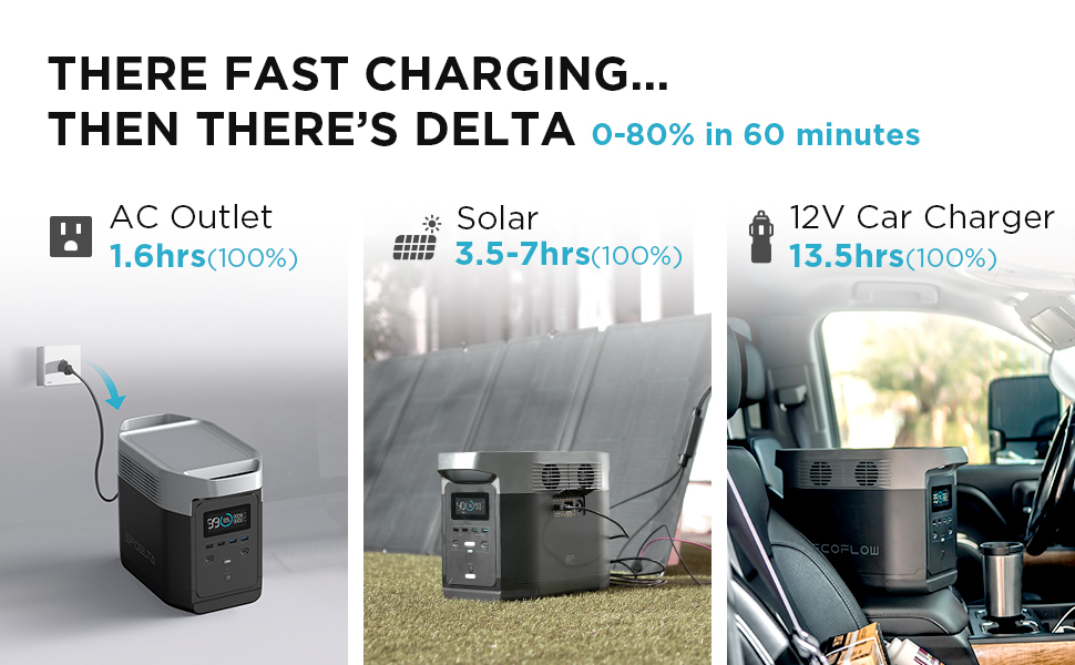 • 【Recharge From 0% TO 80% Within 1 Hour】EFDELTA can be recharged from 0% to 80% in 1 hour and to 100% in 2 hours. X-STREAM TECHNOLOGY: ECOFLOW patented X-Stream Technology empowers EFDELTA recharged at 10 times the speed of most portable power stations in the market with just a standard AC cable. (NO HEAVY, BULKY ADAPTOR or BRICK).