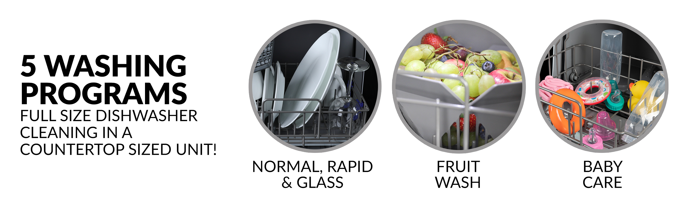 - FIVE WASHING PROGRAMS: You'll get full size dishwasher cleaning in a countertop sized compact unit that offers five wash programs - Normal, Rapid, Fruit Wash, Baby Care and Glass. Lower and upper spray arms give dishes that streak-free deep cleaning