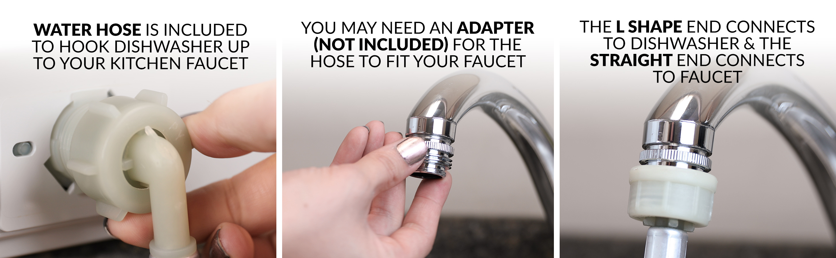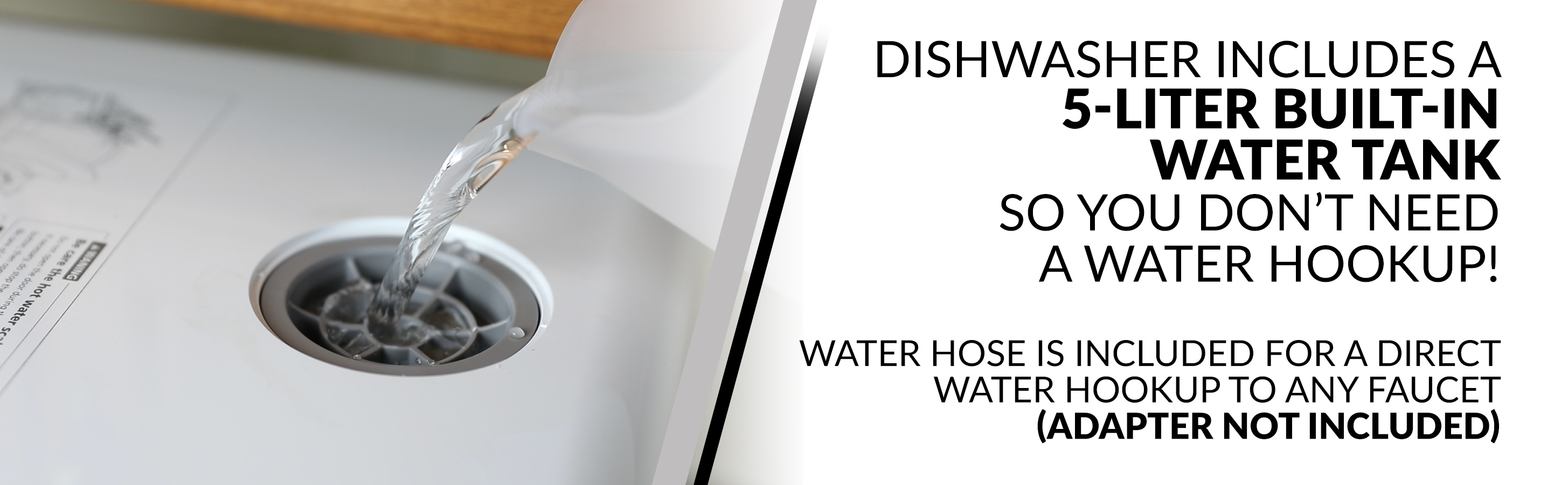 - NO HOOKUPS NEEDED: If you want the advantage of portability and storage, this dishwasher gives you the choice to fill the built-in tank so you don't need a water hookup. Water hose is included for a direct water hookup to kitchen faucet (adapter not included)