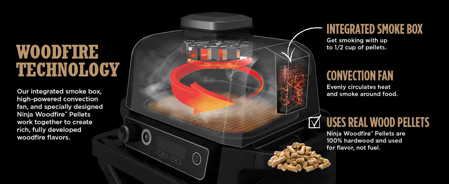 • WOODFIRE TECHNOLOGY: Powered by electricity, flavored by real burning wood pellets. Create rich woodfire flavor you can see and taste with any cook function.
