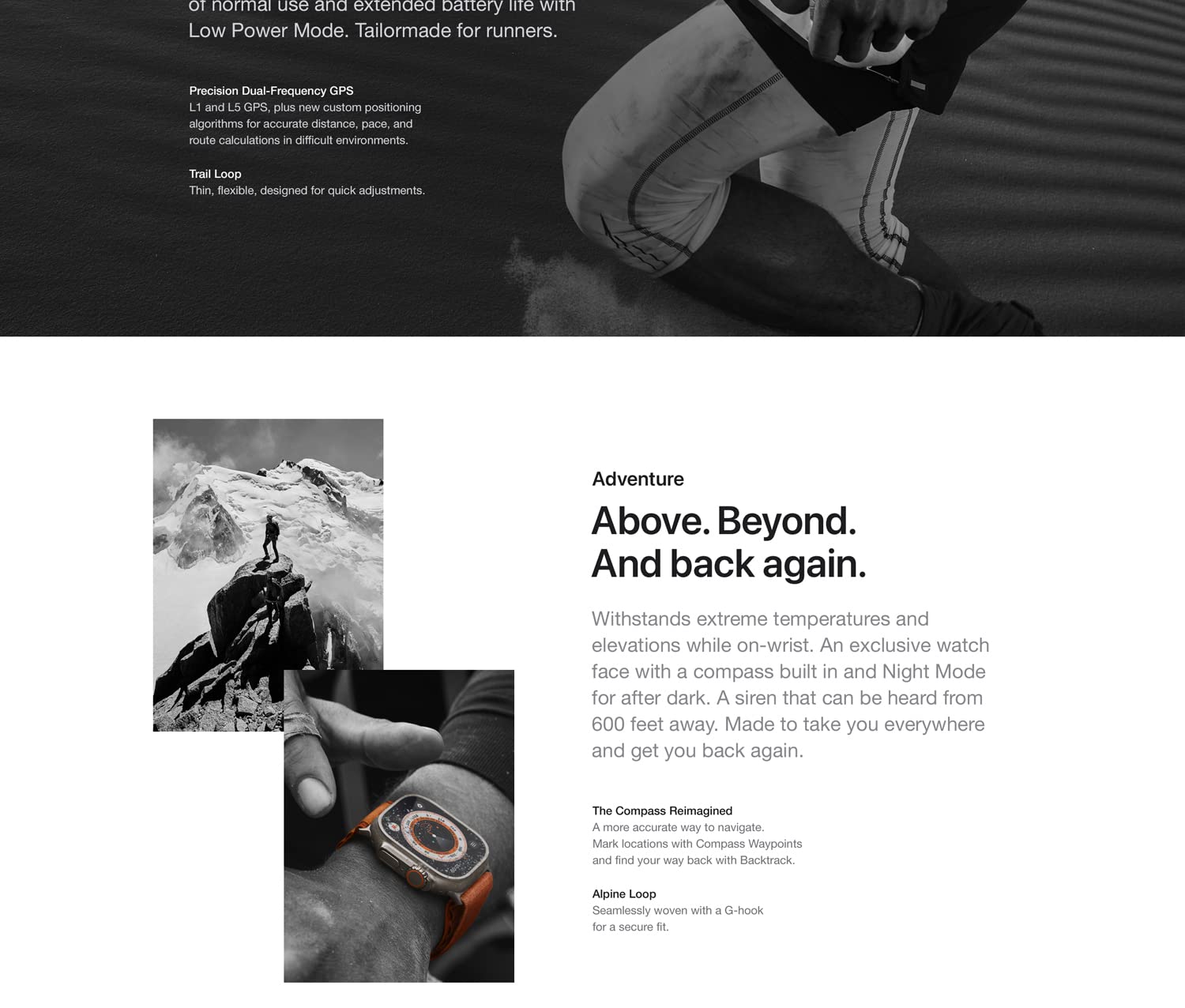 - FOR OUTDOOR ADVENTURERS — Redesigned Compass app delivers all-new views and functionality. Mark your location with Compass Waypoints. Backtrack uses GPS to map where you’ve been so you can retrace your steps. Alpine Loop band is extremely rugged and secure to meet the needs of hikers and climbers.