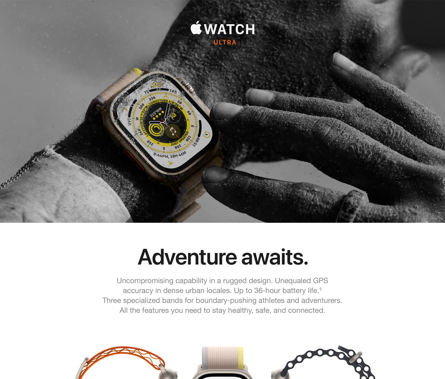 - WHY APPLE WATCH ULTRA — Rugged and capable, built to meet the demands of endurance athletes, outdoor adventurers, and water sports enthusiasts — with a specialized band for each. Up to 36 hours of battery life, plus all the Apple Watch features that help you stay healthy, safe, and connected.