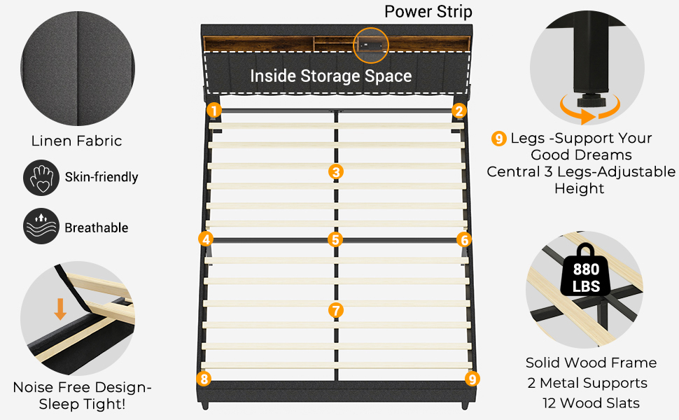 Size Queen Bed with Power Strip Material Wood, Linen, Metal Product Dimensions 84"L x 60.6"W x 47.7"H Style Vertical Headboard-Power Strip Special Feature Headboard with storage and power strip Color Dark Grey Included Components Bed Frame, Storage Headboard, Power Strip, Wooden Slats Compatible With Mattress Size Queen Bed Brand Tiptiper Maximum Weight Recommendation 880 Pounds Item Weight Customer ReviewsNo commentsFrequently Asked Questions About ProductPlease read our frequently asked questions to find out more.-