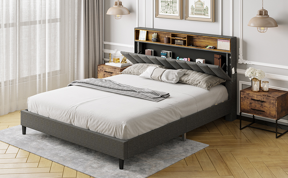 【Furniture】Queen Bed Frame with USB Ports and Outlets, Upholstered Platform Bed with Storage Headboard