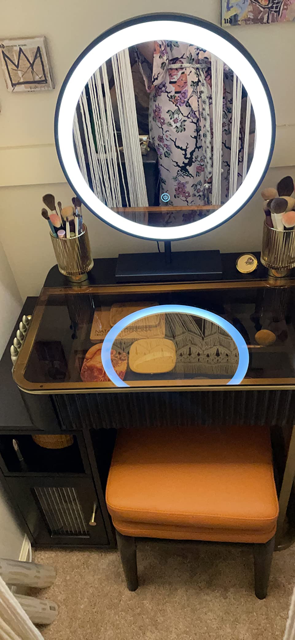 [Touch Screen Mirror with 3-Color LED Light] Mirror can be switched between cool white, warm white and warm yellow. No flicker and dazzling, create exquisite makeup and leave you a professional dressing room experience at home! The high-definition round mirror clearly shows your beauty from a large angle.