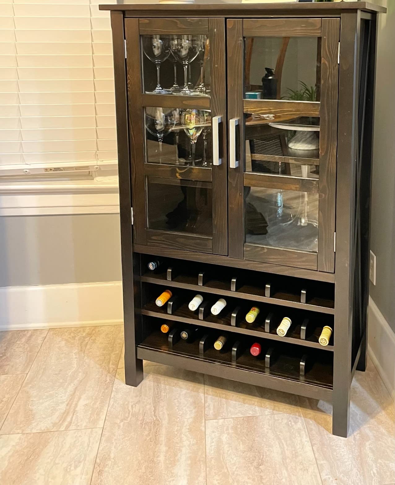 Looking for a nice, compact storage cabinet in which you can store your wine, your wine glasses and dining ware? Enjoy all the amazing functionality that you need with our solid wood Kitchener High Storage Wine Rack. Store all your entertaining needs from stemware to accessories in the large storage compartment behind the attractive framed tempered glass door and stock your favorite wine in the wine rack below.; Efforts are made to reproduce accurate colors, variations in color may occur due to computer monitor and photography; At Simpli Home we believe in creating excellent, high quality products made from the finest materials at an affordable price. Every one of our products come with a 1-year warranty and easy returns if you are not satisfied
