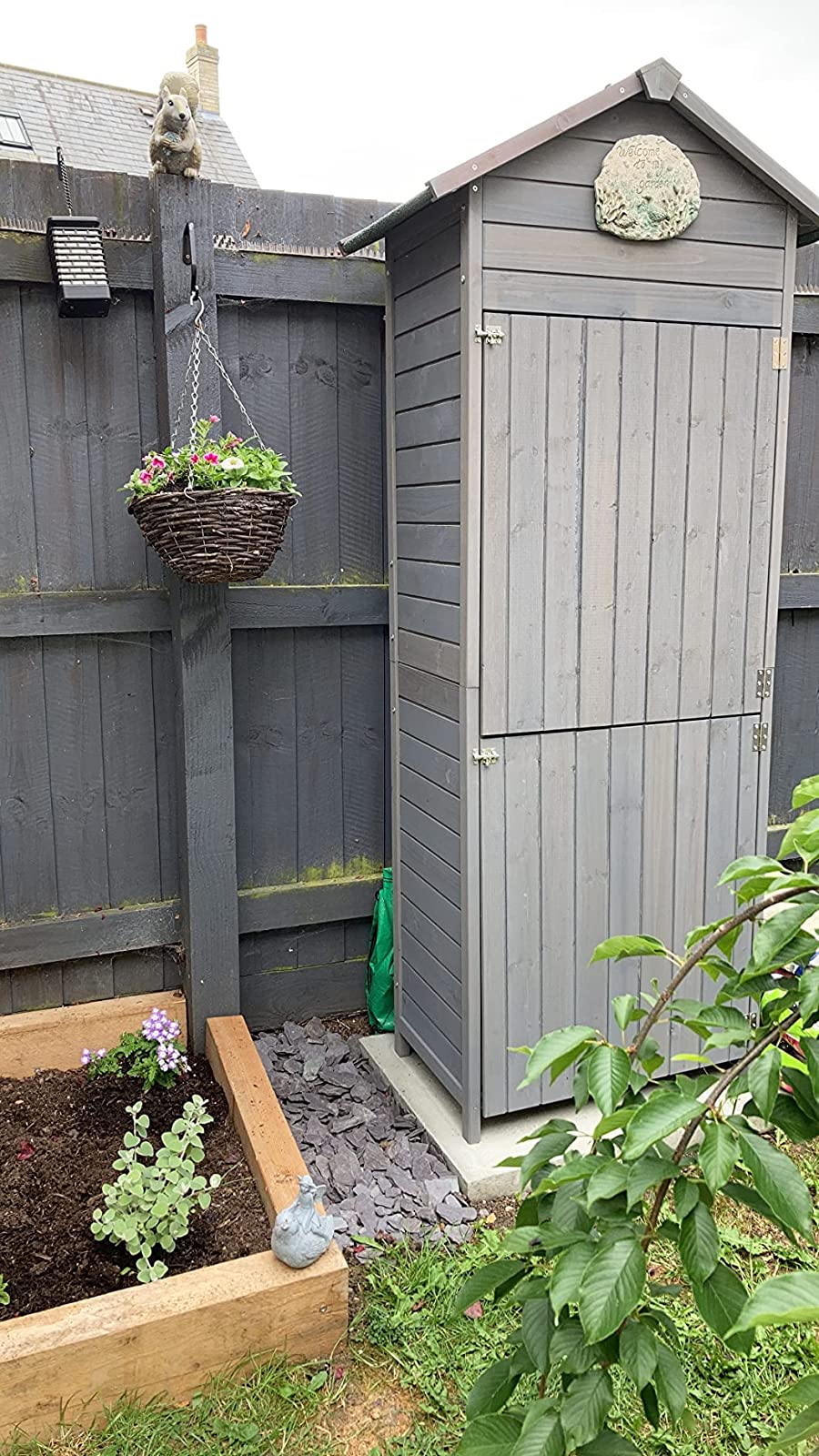 Easy to assemble. Small, but big enough to store sweeping brush, shovel, spade, hoe, bird seed etc. Not waterproof, rains in a little if the rain is heavy.